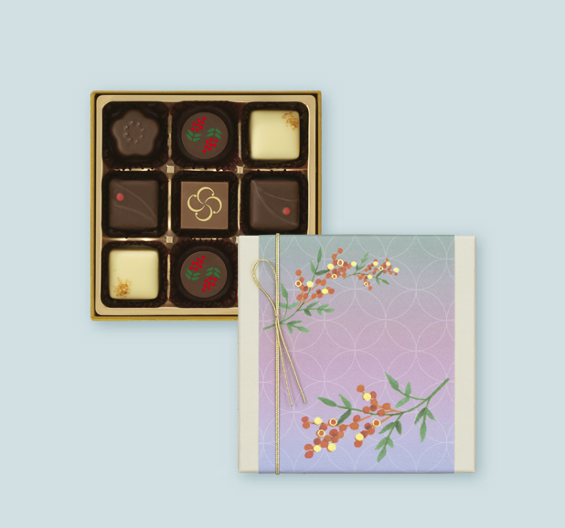 寒い冬に心温まる味わいの「ほうじ茶」やほっこりとした和菓子仕立ての「あずき」などを詰め合わせました。パッケージの帯とチョコレートには南天を描きました。